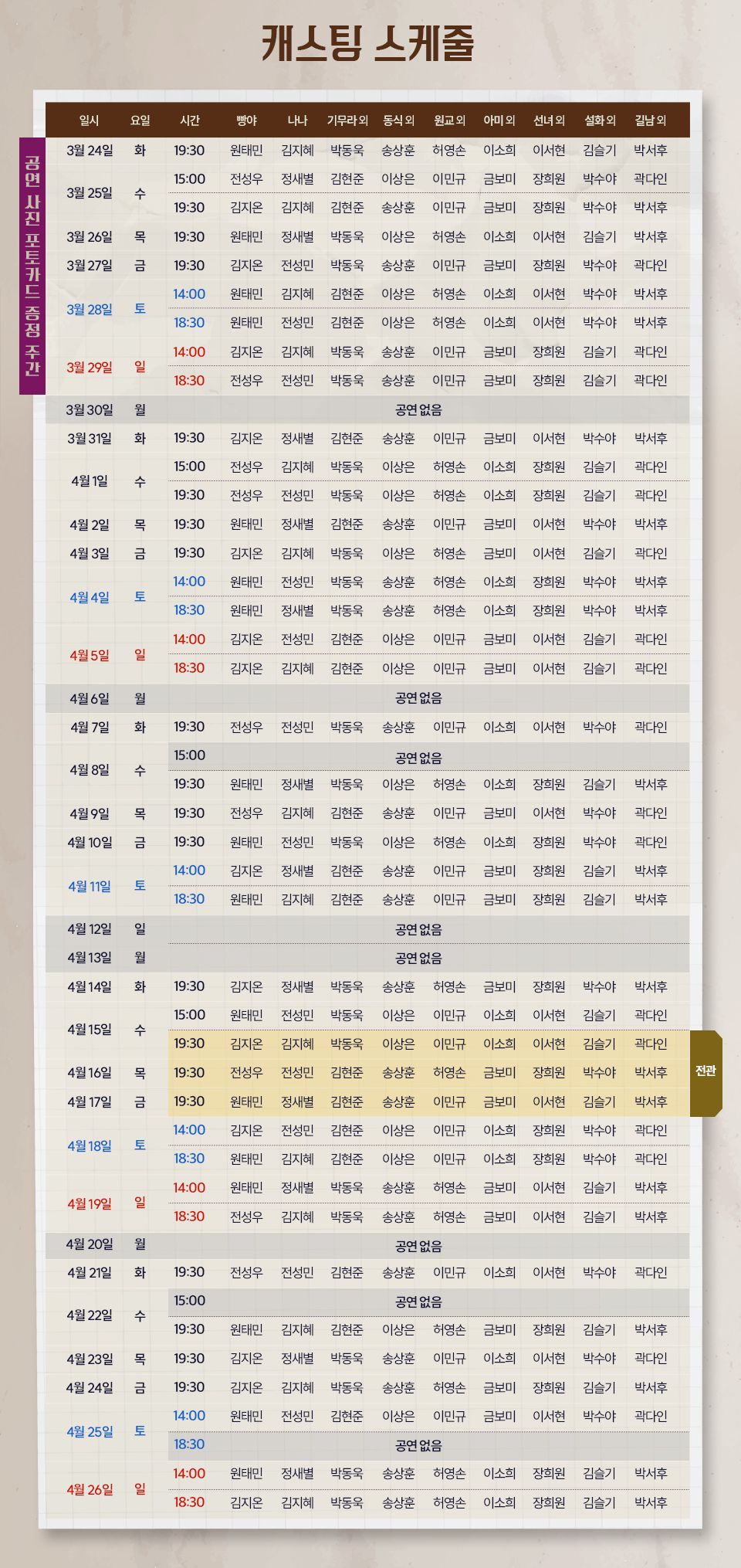 ※ 4/15(수) 19시 30분, 4/16(목) 19시 30분, 4/17(금) 19시 30분 공연은 전관 행사로 추후 별도 오픈 예정입니다.