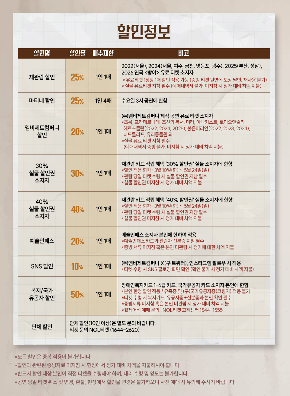 - 할인 증빙 자료 미지참 시 정가 대비 차액을 지불해 주셔야 티켓 수령이 가능합니다.