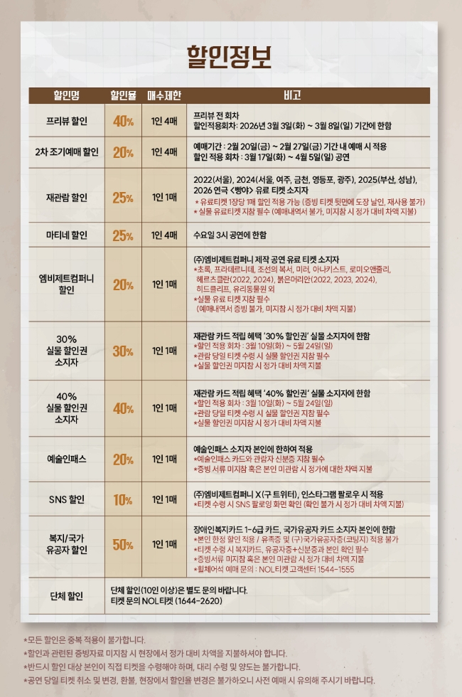 - 공연 당일 할인 권종 변경 및 변심으로 인한 예매 취소/교환/환불은 불가합니다.